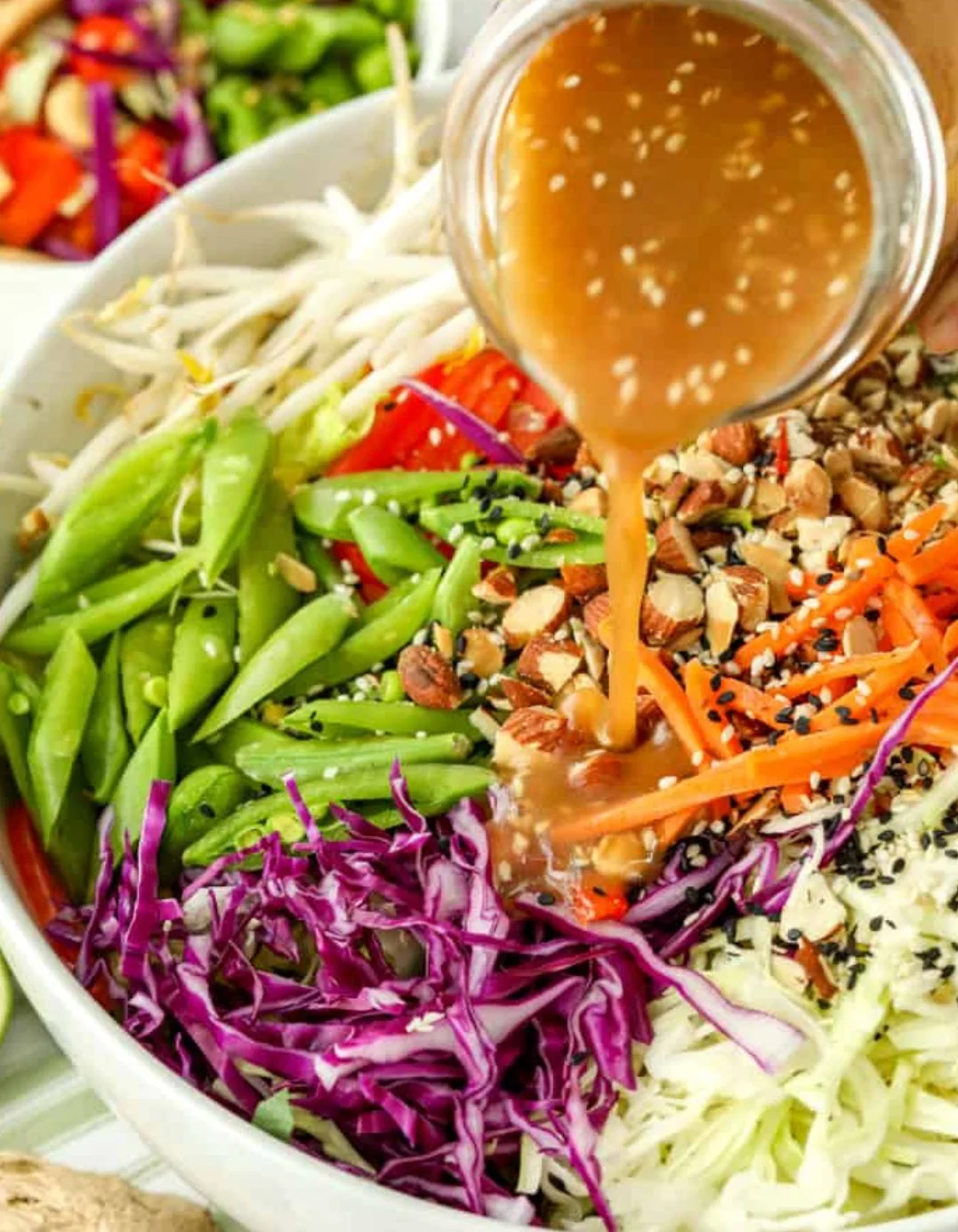 Romaine and shredded cabbage topped with carrots, snap peas, bell peppers, almonds, scallions and sesame seeds.
