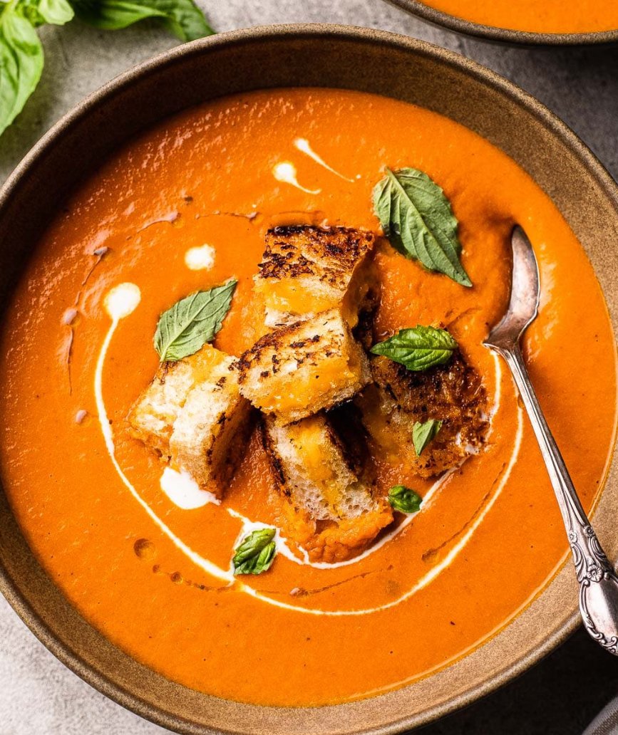 Image 1 of 1 Bacon Tomato Soup w/ Cheddar Croutons $14.50 Creamy tomato soup simmered with bacon, aromatics and herbs. Served with cheddar sourdough croutons. Soy-Free, Nut-Free Quantity: Add To Cart Added! Creamy tomato soup simmered with bacon, aromatics and herbs. Served with cheddar sourdough croutons. Soy-Free, Nut-Free