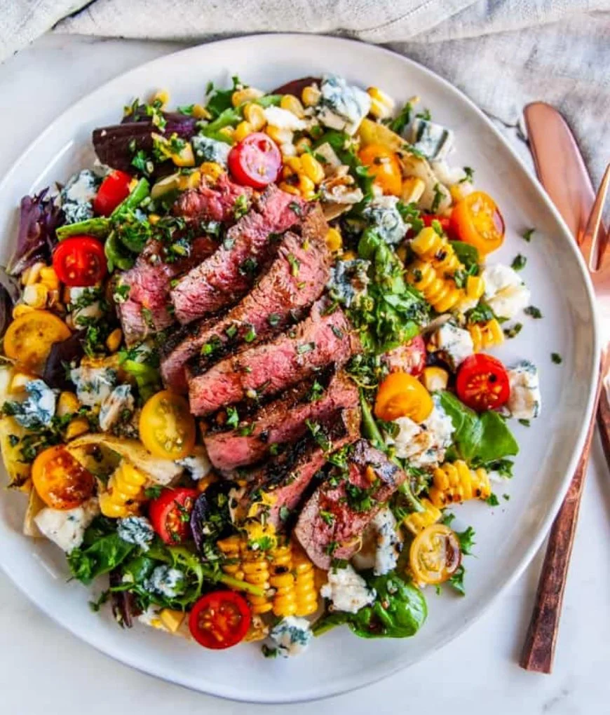 Romaine lettuce topped with balsamic marinated flank steak, gorgonzola cheese, cherry tomatoes, red onion and corn, served with a balsamic vinaigrette.