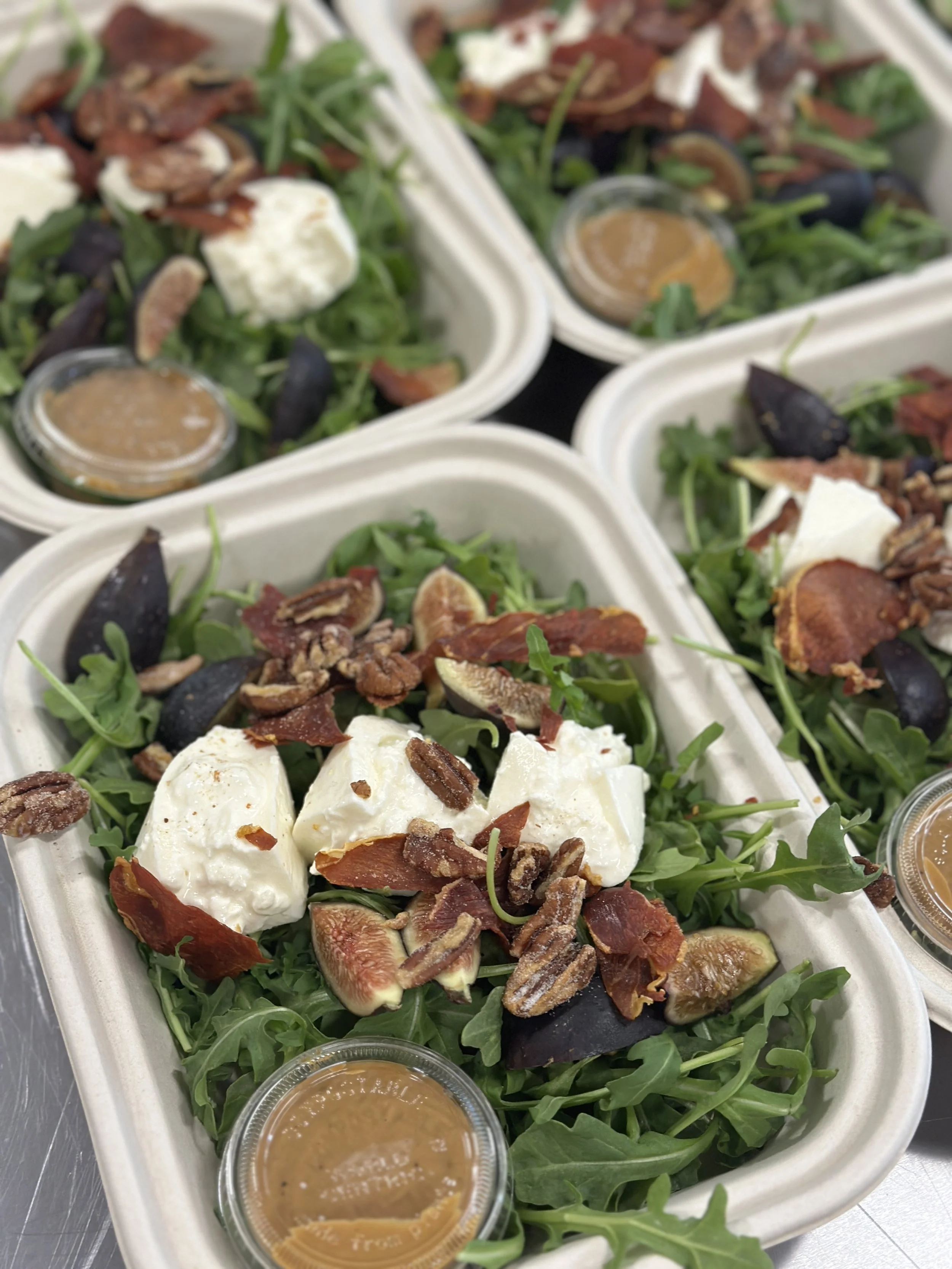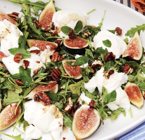 Arugula topped with burrata cheese, fresh figs, crispy prosciutto, honey pecans and balsamic vinaigrette.