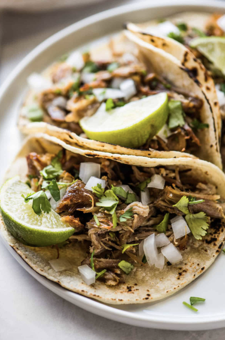 Tender shredded pork carnitas. Served with tortillas, cilantro, onion, lime and Mexican green rice.