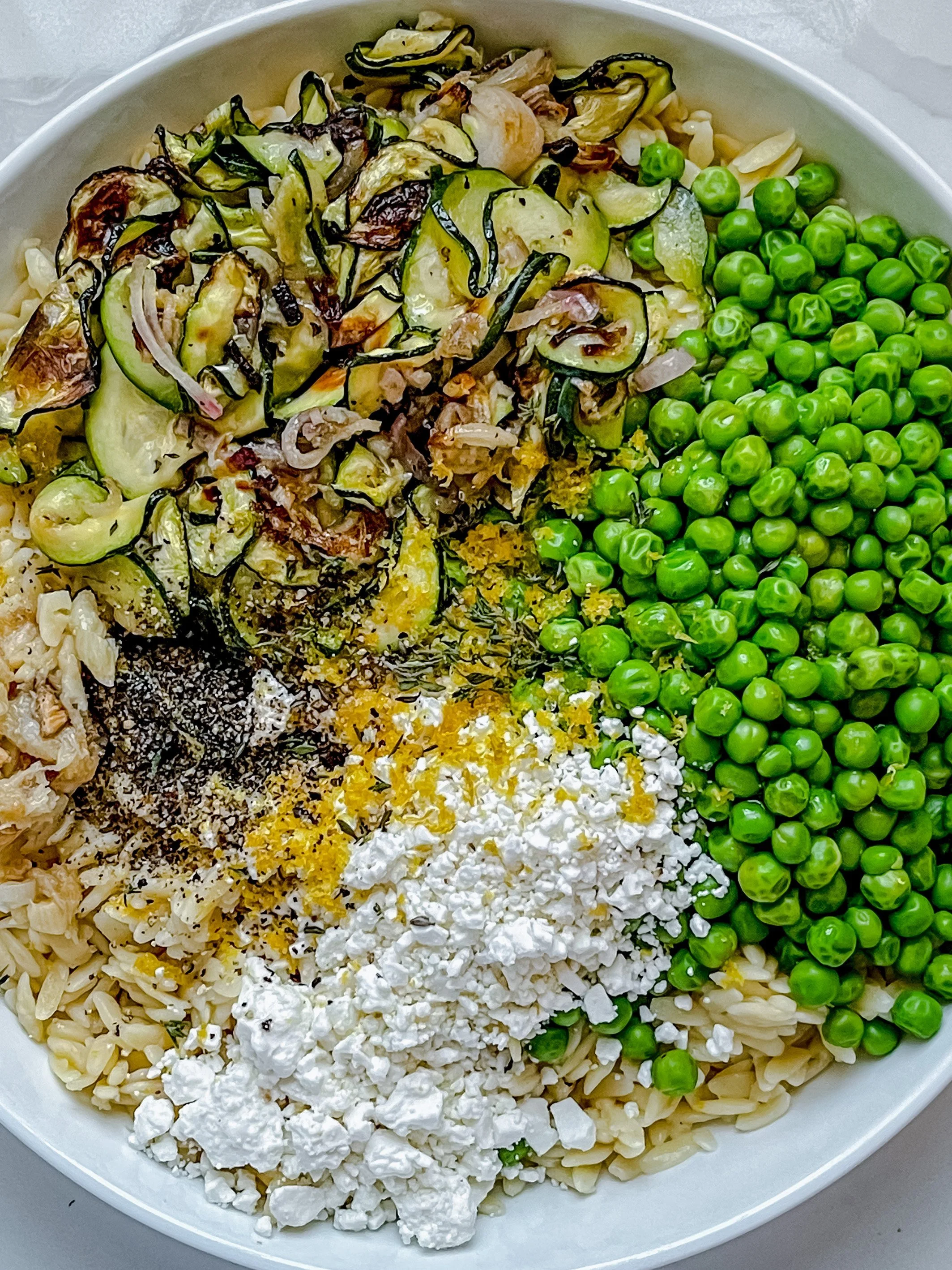 Roasted salmon with a creamy lemon and dill sauce. Served with roasted zucchini, pea and goat cheese orzo.