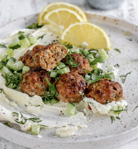 Beef meatballs seasoned with mild harissa, garlic, lemon and herbs. Served with whipped feta spread, roasted carrots seasoned with paprika, cumin and herbs and pita.