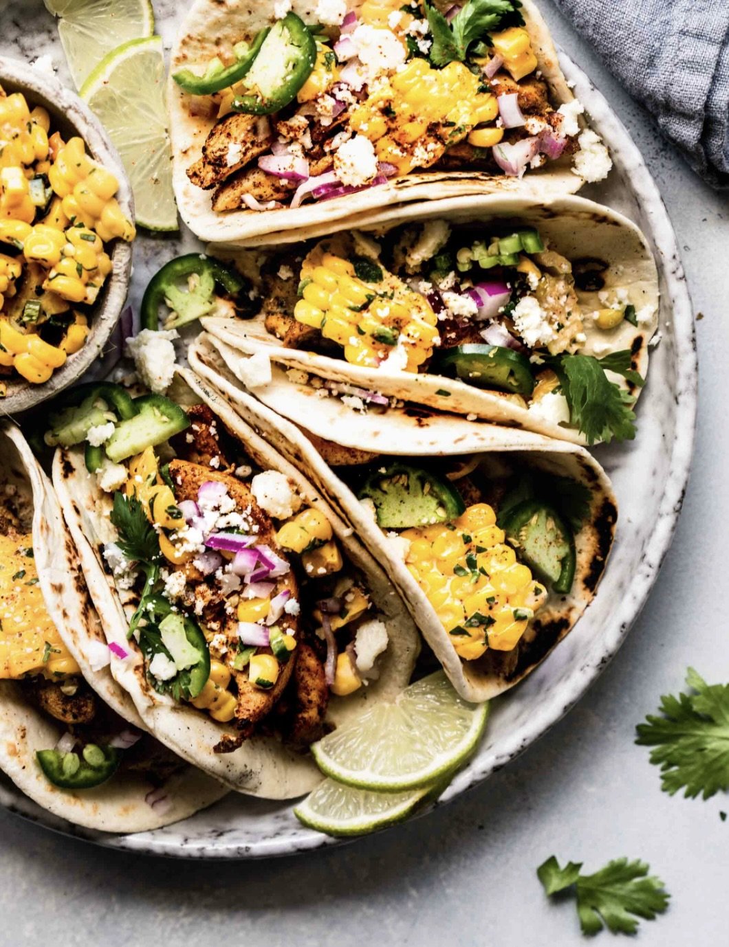 Image 1 of 1 Mexican Street Corn Chicken Tacos $15.50 Marinated grilled chicken with a street corn salsa, queso fresco, and Mexican crema in flour tortillas.Soy-free, Nut-free Add To Cart Added! Marinated grilled chicken with a street corn salsa, queso fresco, and Mexican crema in flour tortillas.Soy-free, Nut-free