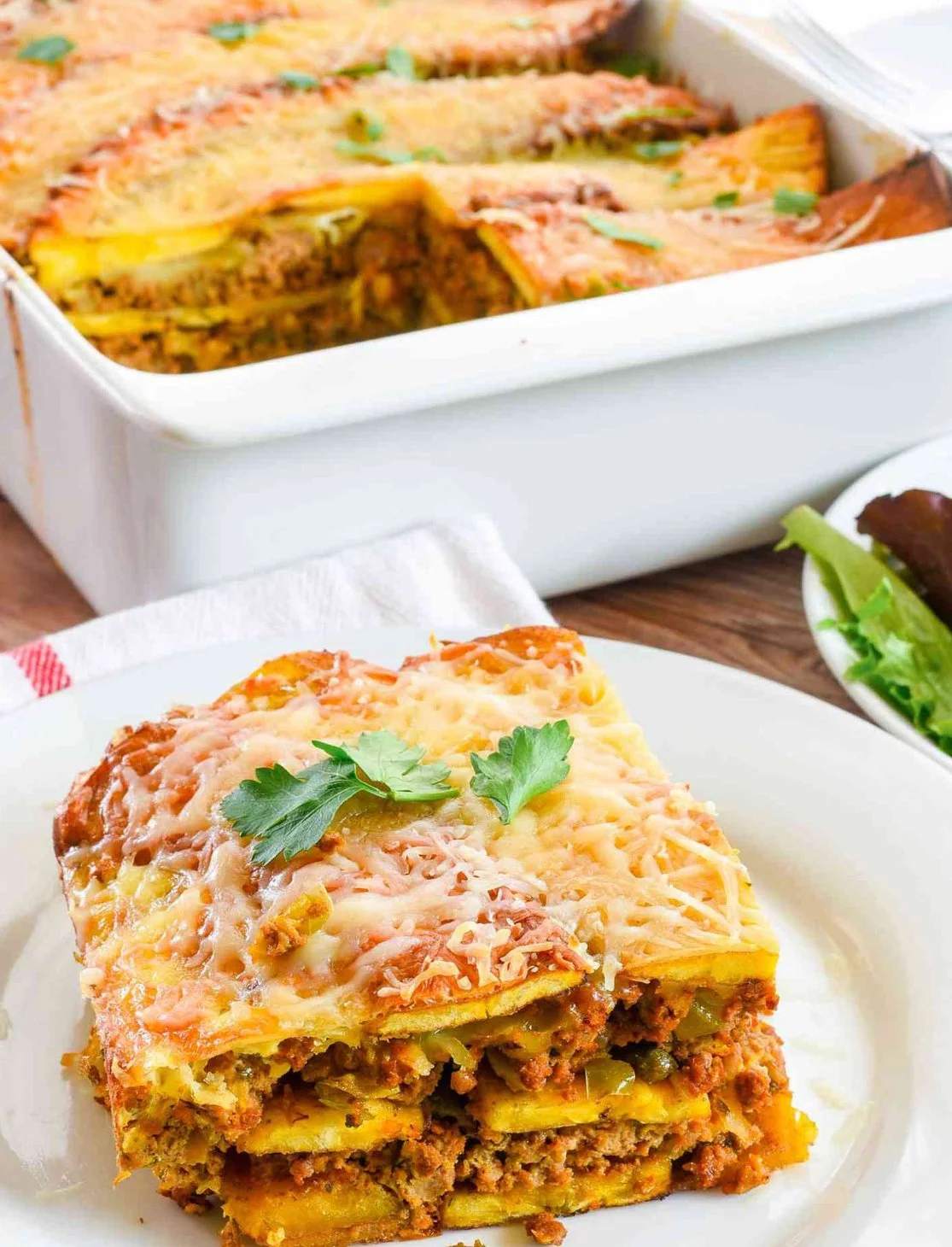 Layers of sweet plantains, cheese and picadillo, a tomato-based ground beef mixture seasoned with onions, peppers, herbs and spices.