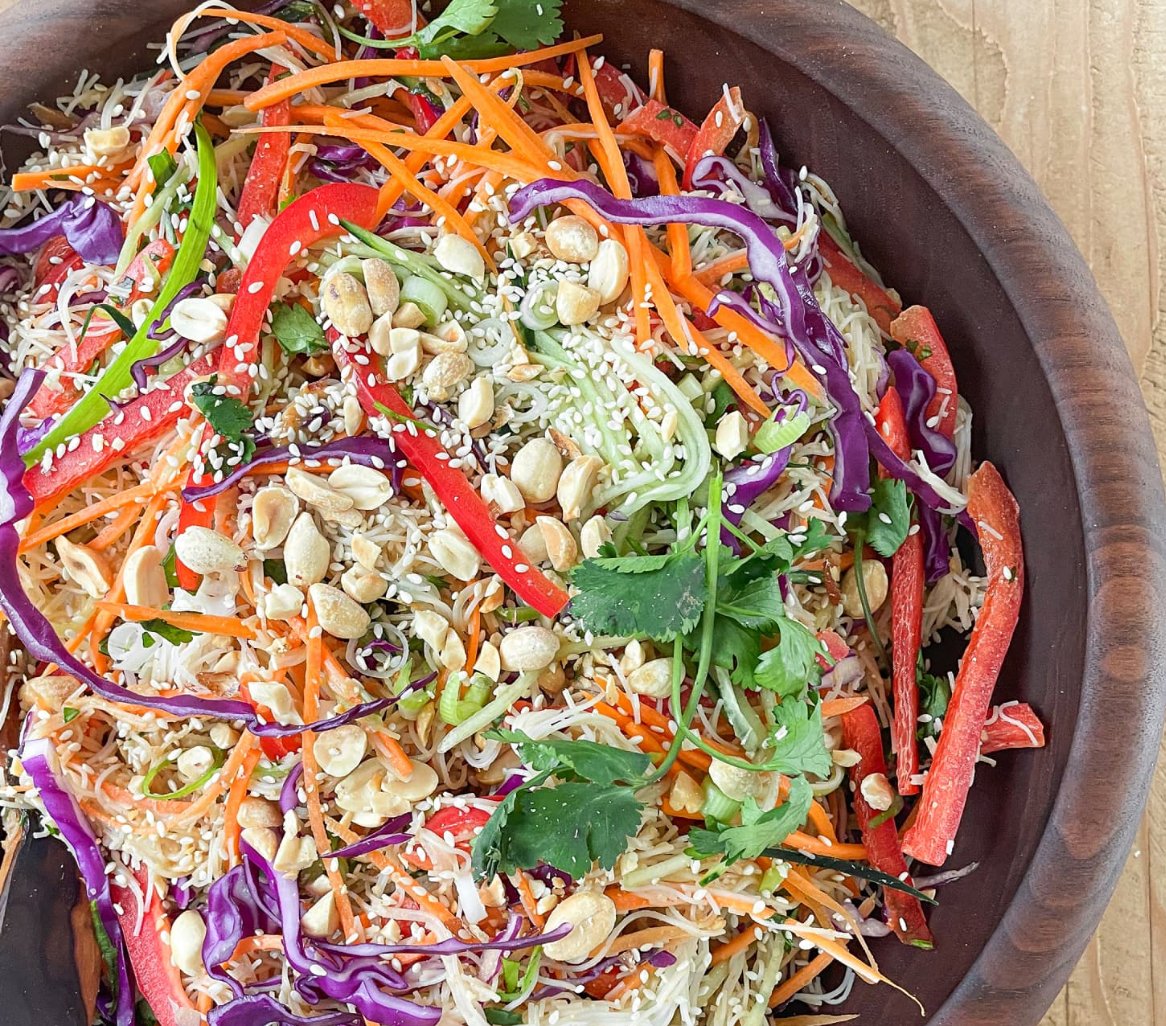 Rice noodles, carrots, cucumbers, cabbage, bell peppers, peanuts and herbs served with a spicy ginger dressing.